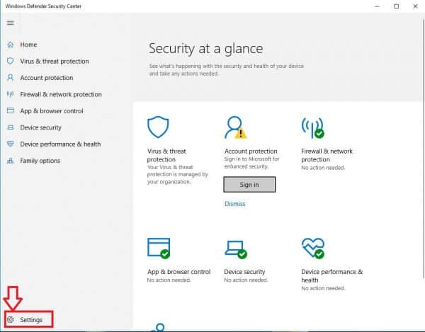 Bước 1: Vào khung tìm kiếm nhập Windows Defender Security Center, xong nhấp vào biểu tượng Settings ở góc dưới bên trái.