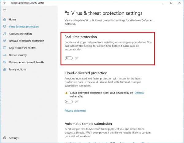 Bước 3: Tắt Real-time protection là xong.