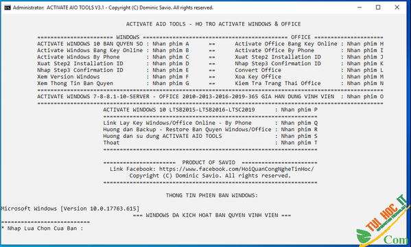 2. Các mục [A] ACTIVATE WINDOWS 10 BAN QUYEN SO & [O] ACTIVATE WINDOWS7-8-8.1-10-SERVER/OFFICE2010-2013-2016-2019-365 GIA HAN DUNG VINH VIEN đều có hướng dẫn cụ thể chi tiết ở phần _Thông Tin Script Kích hoạt_.