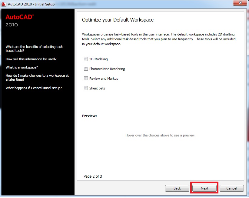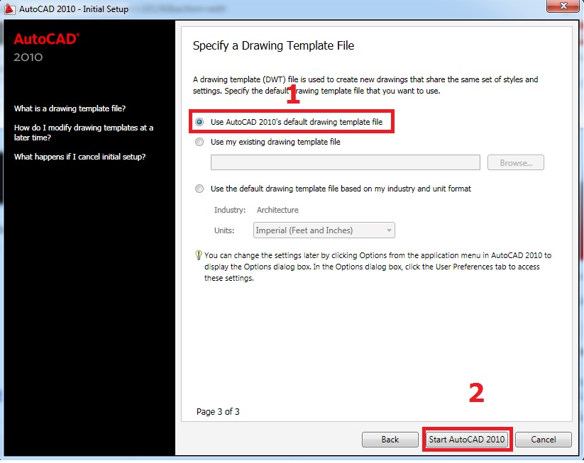 Chọn Use Autocad 2010’s default drawing template file, nhấn Start Autocad 2010: