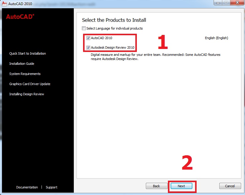 Bước 2: Chọn cài đặt Autocad 2010 và Autodesk design Review 2010, nhấn Next