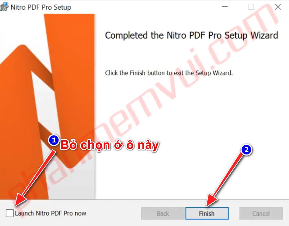 LƯU Ý: Bỏ chọn ở ô Lauch Nitro Pro Now, rồi mới bấm Finish